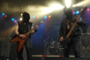Und dann kamen die dreckig gezeugten Kinder von VENOM und MOTÖRHEAD, von HELLHAMMER und SODOM. Die Mischung aus Thrash und Speed, aus Black Metal und Heavy Metal war genau richtig, um die verkaterte Menge am früh-mittäglichen Samstagmorgen in Wallung zu bringen. Erst mal auf die Bühnen stürmend, waren alle Band-Mitglieder mit schwarzen Helmen (und Netz dran) maskiert. Die Herrschaften kamen auch nicht vom Bienen-Züchter-Jahrestreffen, sondern sie kamen nach Lauda-Königshofen um zu rocken.