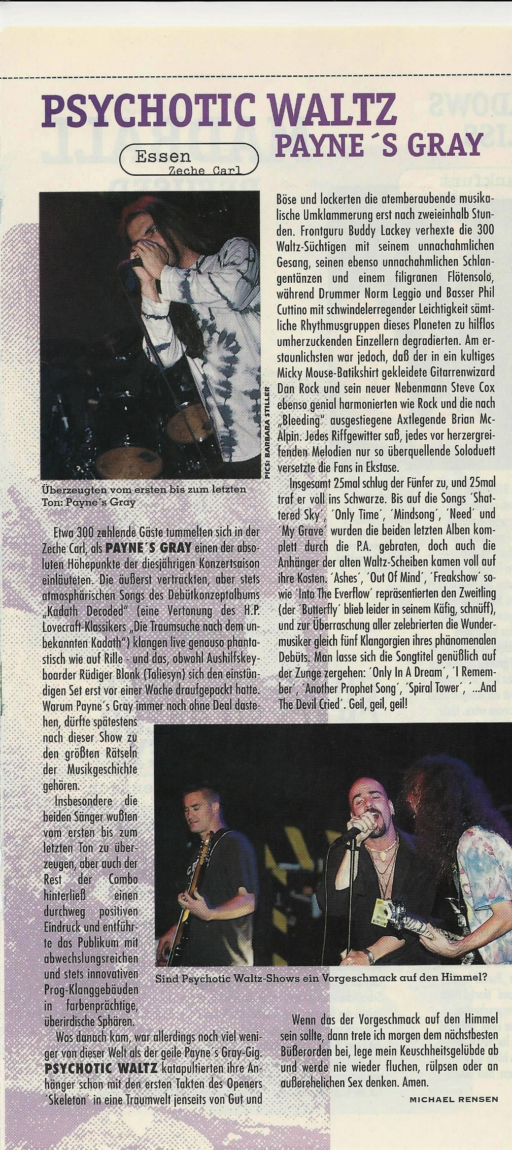 Ansonsten war die Tour super. Es ging in Holland los, weil PSYCHOTIC WALTZ immer dort Ihre Tour starteten, um sich mit bewusstseinserweiterndem Gewächs einzudecken. Die Agentur hatte uns versichert, wir bräuchten keine Drums mitzubringen, aus Effizienz würden wir mit Waltz ein Set teilen. Davon wusste Norm aber nichts. So war zunächst gleich mal noch bevor ein Ton auf der Tour gespielt wurde, das Verhältnis zwischen uns und meiner Lieblingsband etwas getrübt. Erst als ich mitbekam, dass Buddys Querflöte bei der Anreise geklaut worden war, und das sie demnach nicht ´I Remember‘ spielen konnten, überzeugte ich Jan, Buddy seine Querflöte anzubieten…was nicht ganz einfach war, da Jans Instrument ziemlich wertvoll ist, aus Silber oder so was, und er zunächst nicht wollte. Aber Buddy war dann sehr dankbar, brachte Jan die Flöte sofort zurück, während ´I Remember‘ noch gespielt wurde, verbeugte sich dankend, und ab da war alles in Butter. Norm war dann auch cool mit dem Schlagzeug-Teilen. Beim Gig in Heidelberg hat er mit uns sogar ´The Way To Ngranek‘ gespielt, mit Daniel zu zweit am Set.
