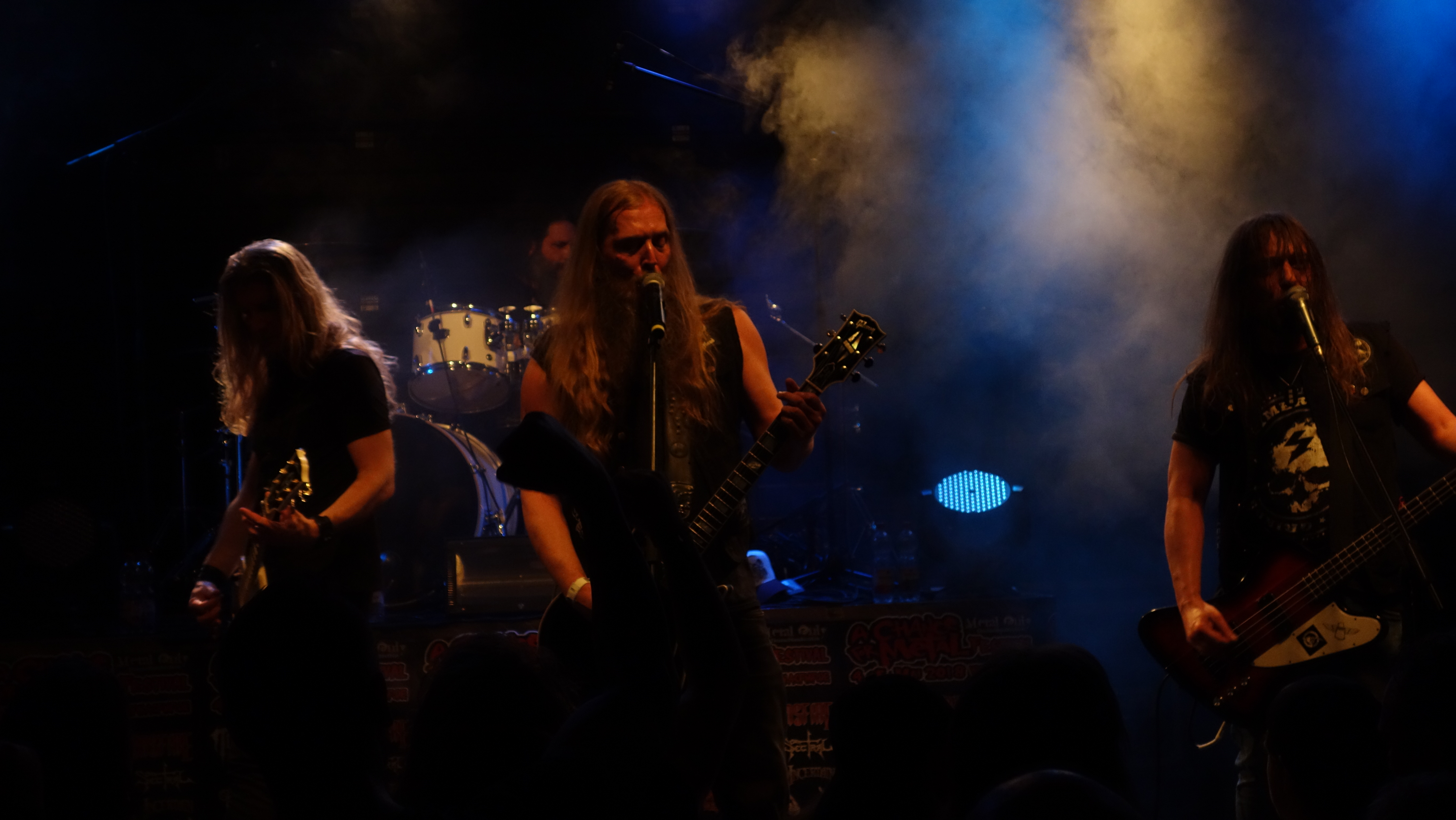 Rhein-Ruhr-Finnland. Was zum Teufel? Publikumswunsch ist Publikumswunsch und das Leben hält immer Überraschungen bereit. So ist es zu erklären, dass der Rekord der weitesten Anreise auf den Namen MASK OF SATAN fällt, jedoch bleibt leider der Rest vom Schützenfest weiter sitzen oder liegen. Egal, mystische Kapuzenträger (er)deathblacken sich mit ‘Chants Of Lovecraftian Horror’ auf herrlichste Weise die Herzen mit ‘M’s sphärischen Bassverschnaufpausen, Dschinghis Khan-Schnorresträger ‘O’s virtuosem Schlagzeugspiel statt durchrasselnder Doublebass und den Gitarrenattacken von ‘S’. Endlich mal wieder Death Metal, der in keine Schubladen.passt, kann auch Death, Black & Roll gewesen sein. Absolut stimmungsvoll und famos.