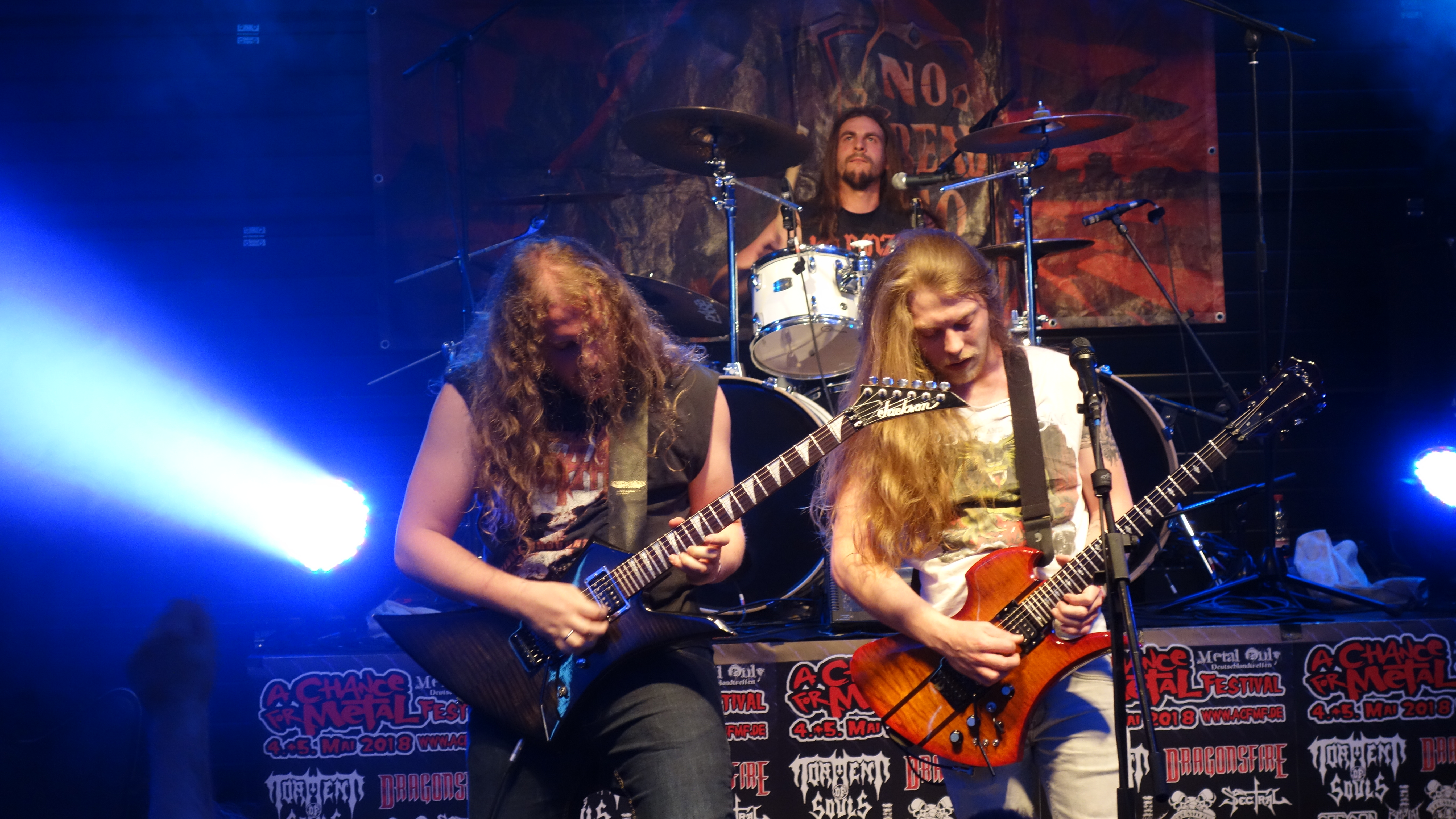 MESSERSCHMITT aus Remscheid eröffnen mehr als würdig mit ihrem abwechslungsreichen Oldschool Speedmetal von ihrem ersten Longplayer, der zu keiner Zeit angestaubt wirkt – eine wahre Pracht. Beim Stageacting gibt’s absolut nix zu meckern, besonders ihr hyperaktiver Bassist Florian verweist so manchen Profi in die zweite Liga. Mit wallender rot-blonder Mähne bringt dich Sänger und Gitarrist Maik zum Grübeln, wie Dave Mustaine wohl früher aussah. Der Schädelpilot vom Ed Repka-mässigen Cover sollte bei dieser Leistung eine gute Überlebenschance als Bandmaskottchen haben.