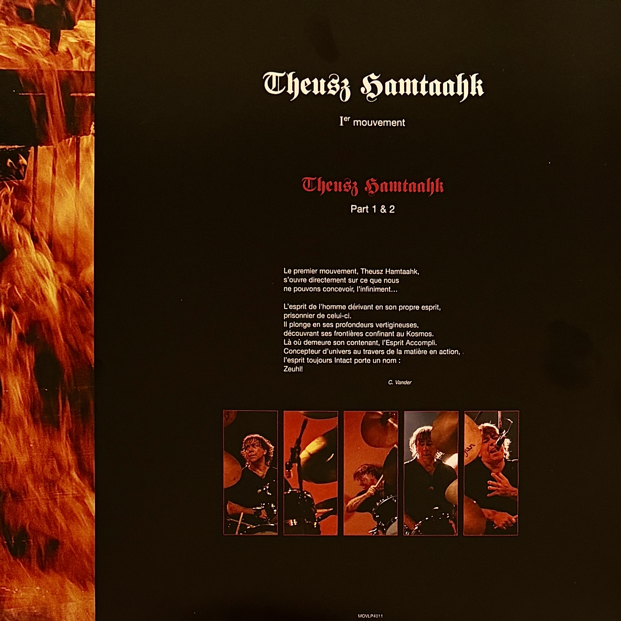Der erste Teil, ´Theusz Hamtaahk´, entfaltet sich über unnachgiebige, repetitiv pulsierende Rhythmen, getragen von Christian Vanders Schlagzeugspiel in beinahe militärischer Strenge. Der Chor und die vierköpfige Bläsersektion steigen stufenweise ein, steigern die Spannung Stück für Stück und brechen immer wieder in hymnische Passagen aus. Dazwischen eröffnen kurze Einsätze einzelner Stimmen oder Instrumente markante Akzente, bevor sich alles wieder zum mächtigen Zusammenklang des Chors bündelt. Das Ergebnis ist eine bedrückende, fast sakrale Atmosphäre, die den epischen Ton für die gesamte Trilogie setzt.