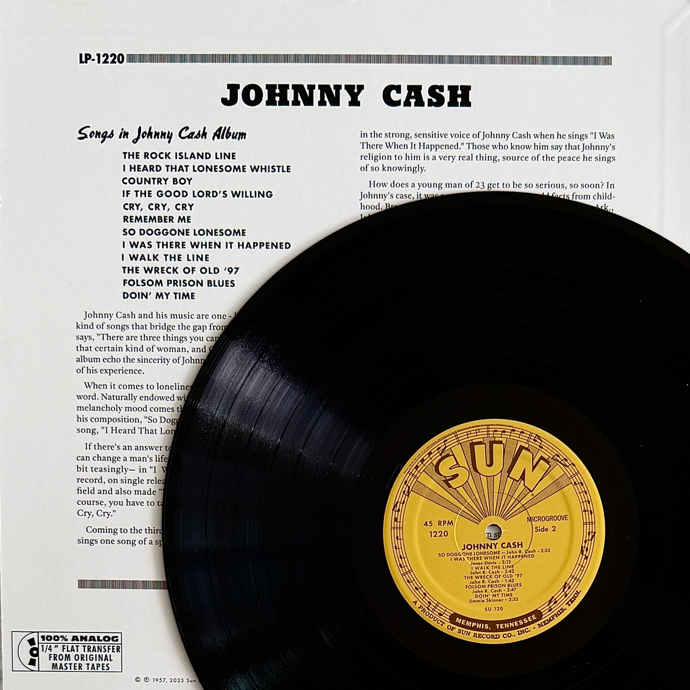 Die Pressung klingt erstaunlich präsent. Johnny Cashs Stimme steht klar im Vordergrund, während Gitarre und Kontrabass eng miteinander verbunden bleiben. Der typische Slapback-Echo des Sun-Studios verleiht dem Gesang diese leicht hallende, fast schwebende Wirkung, die sofort an die frühen Tage des Rockabilly erinnert. Gepresst wurde das Vinyl bei “Gotta Groove Records”, deren saubere Verarbeitung für eine sehr ruhige Wiedergabe sorgt.