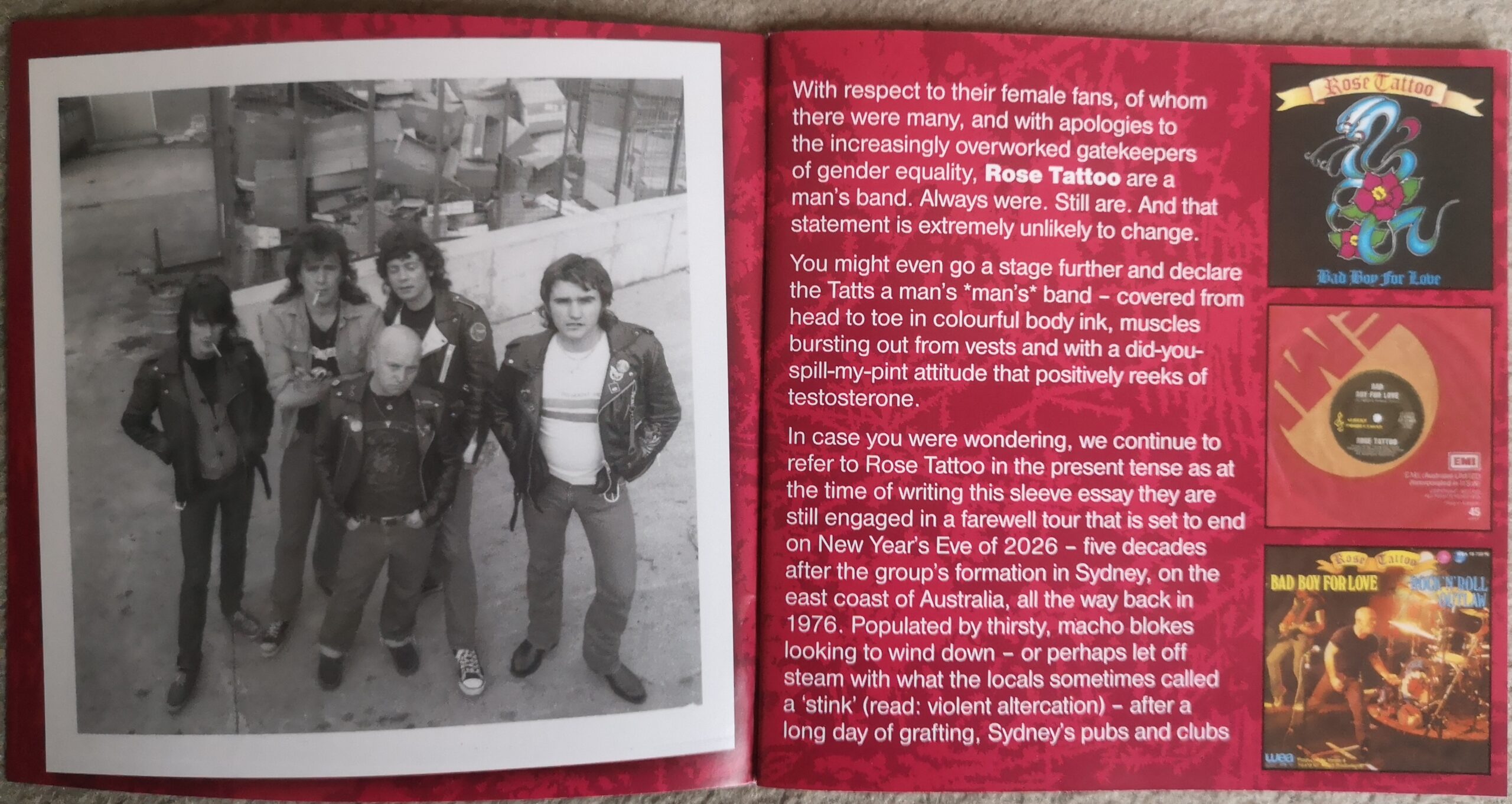 “With Respect to their female fans, of whom there were many, and with apologies to the increasingly overworked gatekeepers of gender equality, ROSE TATTOO are a man`s band. Always were. Still are. And that statement is extremeely unlikely to change”.